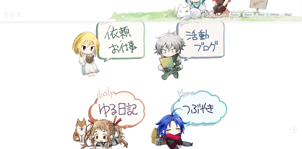 右上にも各ページへのリンクメニューがありますがトップページには可愛いちまキャラを置いてコンテンツをまとめます。