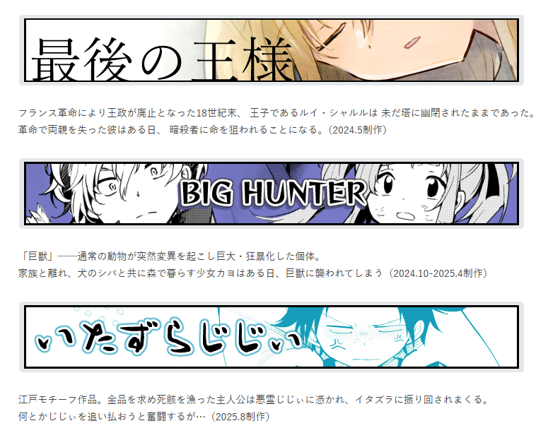 最後の王様はフルデジタル、BIG HUNTERはペン入れだけアナログ、いたずらじじぃはmovinkpad11で夏休みの一週間で描いたやつです。